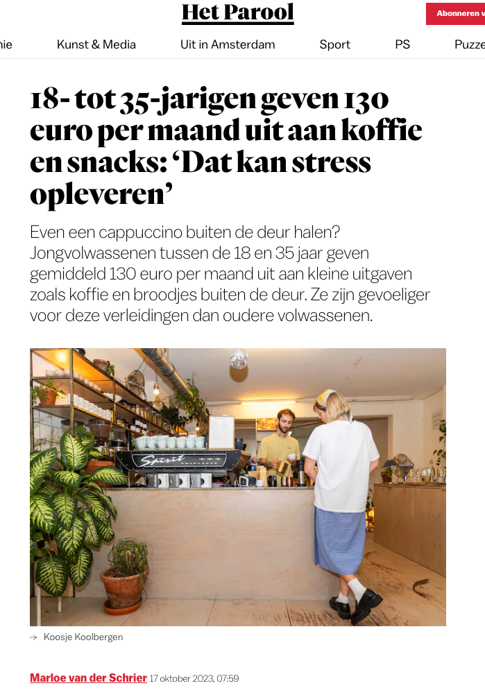 Parool – 18- tot 35-jarigen geven 130 euro per maand uit aan koffie en snacks: ‘Dat kan stress opleveren’