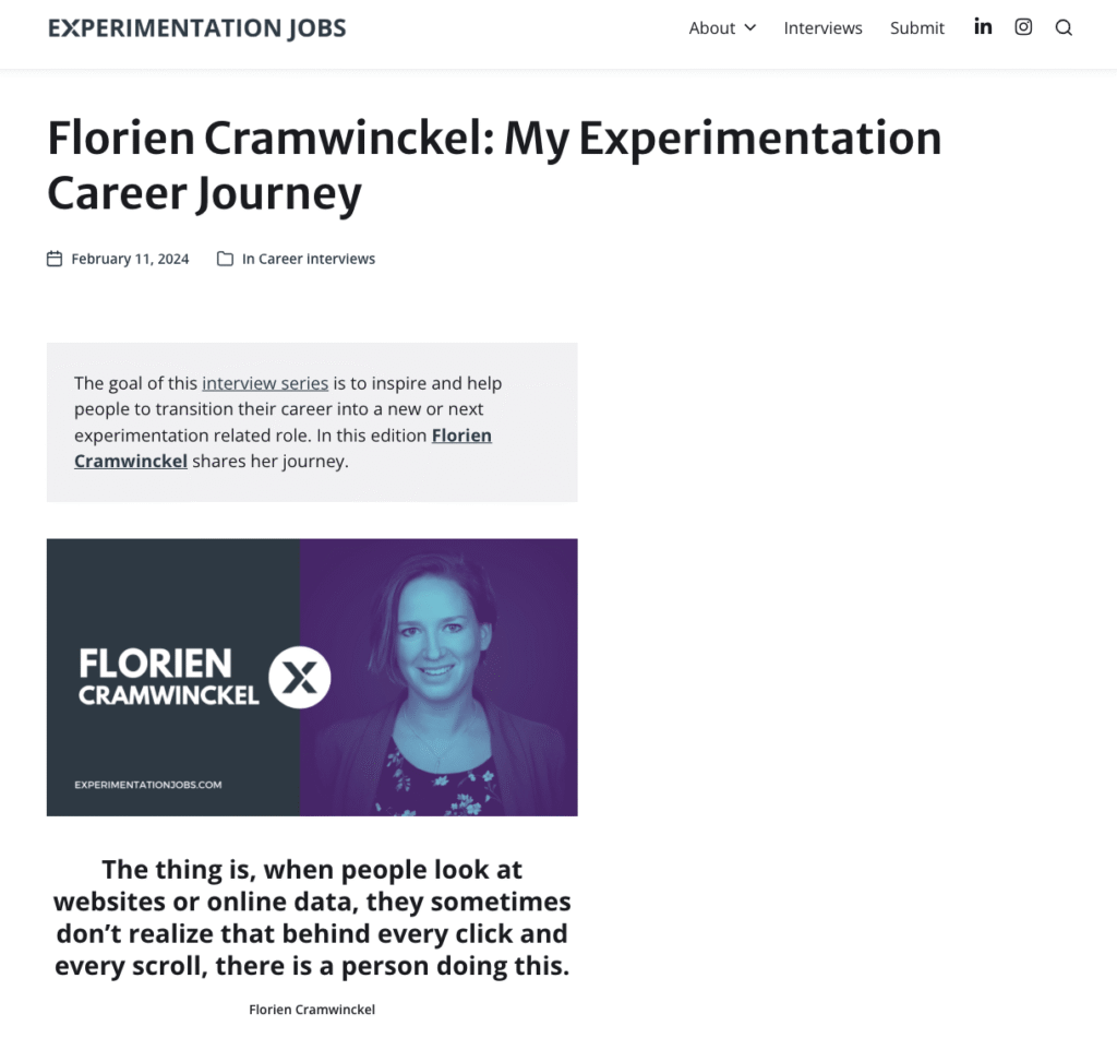 The goal of this interview series is to inspire and help people to transition their career into a new or next experimentation related role. In this edition Florien Cramwinckel shares her journey. lees het volledige artikel hier.