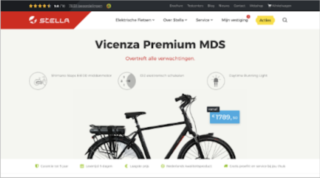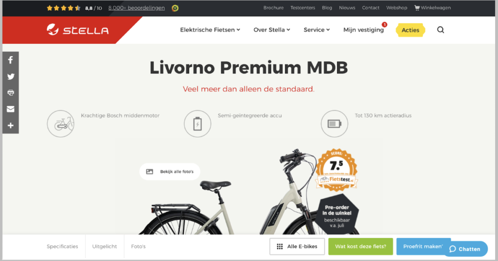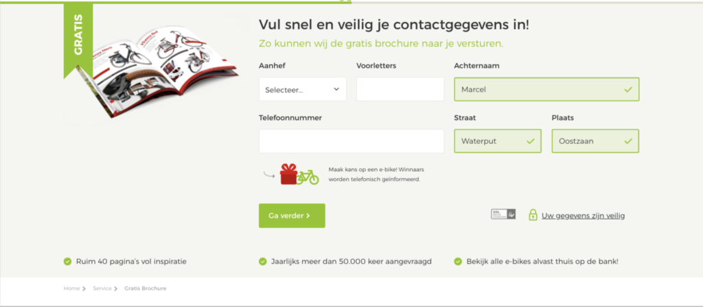 Een voorbeeld. Één van de organisaties waar wij al een aantal jaar mee samenwerken is Stella, de grootste e-bike specialist van Nederland. Stella ontwerpt en bouwt e-bikes, en verkoopt deze rechtstreeks door aan de klant. Bijzonder aan Stella is hun service. Je kunt bijvoorbeeld thuis een proefrit-afspraak maken. Dan komt een busje bij jou thuis voorrijden met meerdere fietsen die je direct kunt uitproberen. Hetzelfde geldt voor een service-afspraak voor onderhoud aan je e-bike. Ook bijzonder is hun website. Op de website zijn geen prijzen te vinden, omdat dit niet de plek is waar ze hun e-bikes daadwerkelijk verkopen. Om de prijzen te achterhalen kunnen geïnteresseerden een brochure en prijslijst online aanvragen. Deze informatie krijgen websitebezoekers dan zowel in hun inbox als thuis in de brievenbus. Bovendien geeft Stella opvolging aan deze aangevraagde brochures door potentiële klanten na te bellen. Mensen die serieus overwegen om een e-bike aan te schaffen kunnen in dat gesprek al hun vragen stellen en/of een afspraak maken voor een proefrit aan huis of in een testcenter. Tijdens deze afspraken kunnen mensen een e-bike uitproberen en, als de fiets helemaal aansluit bij hun wensen en budget, overgaan tot de aanschaf.