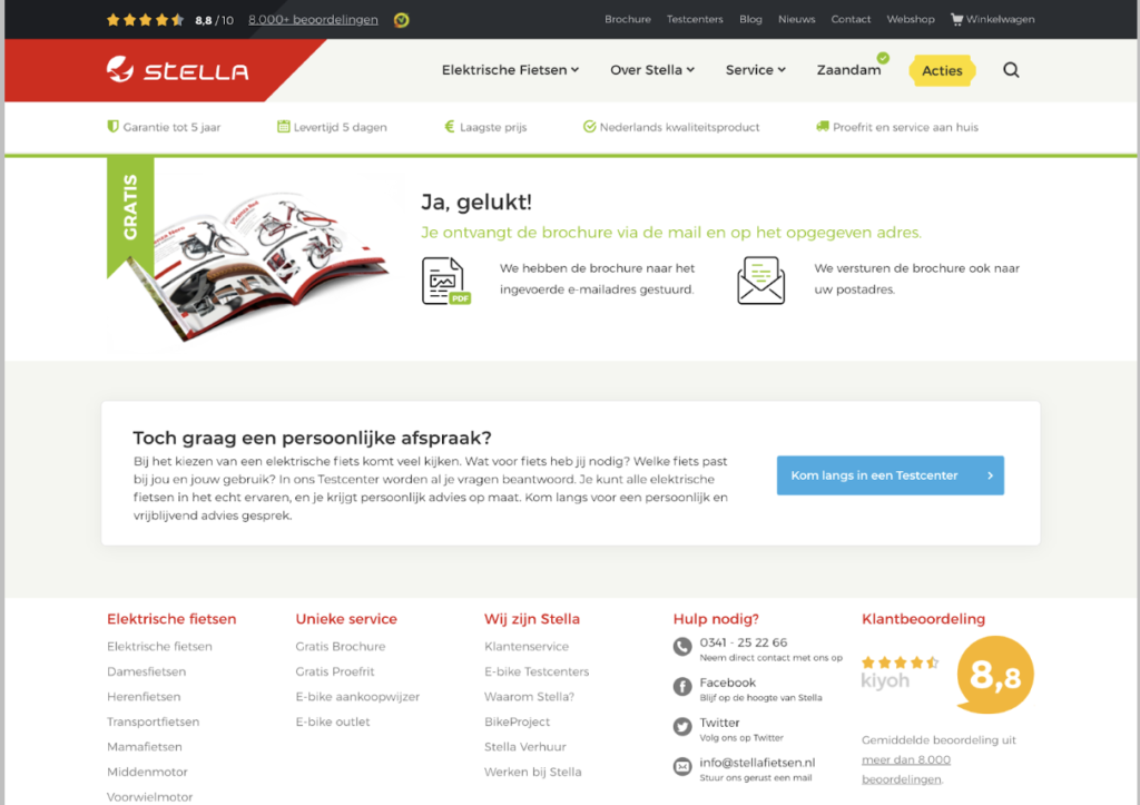 Een ander goed voorbeeld is te zien in afbeelding 5. We namen aan dat bezoekers die brochures aanvroegen vrij serieus geïnteresseerd waren in een e-bike. Dit betekent wellicht ook dat deze bezoekers vragen hadden over welke e-bike het beste bij hun wensen en budget past. Dit soort vragen zijn het beste te beantwoorden in een test-center, waar een medewerker beschikbaar is om alle vragen te beantwoorden en om samen te zoeken naar de meest geschikte e-bike. Bovendien is het voor Stella ook erg zinnig om geïnteresseerde bezoekers naar een test-center te krijgen, want dan is de kans groter dat er ook daadwerkelijk een e-bike wordt verkocht. We deden daarom een experiment waarbij we een extra berichtje plaatsten zodra bezoekers een brochure hadden aangevraagd. Hier vroegen we of de bezoeker toch niet liever een persoonlijke afspraak in een testcenter zou maken. We gaven uitleg over de voordelen van zo’n bezoek (vragen stellen, proefritten) en plaatsten een knop naar het formulier om een afspraak te maken. Dankzij dit experiment zagen we een enorme stijging in het aantal afspraken in de testcenters EN in het aantal verkochte e-bikes.
