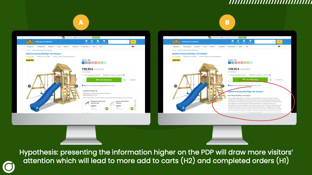 De hypothese bij dit experiment was: door de productbeschrijving hoger op de pagina te plaatsen trekt het meer aandacht, en kunnen bezoekers makkelijker beslissen of het product aansluit bij hun wensen. Daardoor zullen meer bezoekers een product in hun mandje toevoegen, of een bestelling afronden.