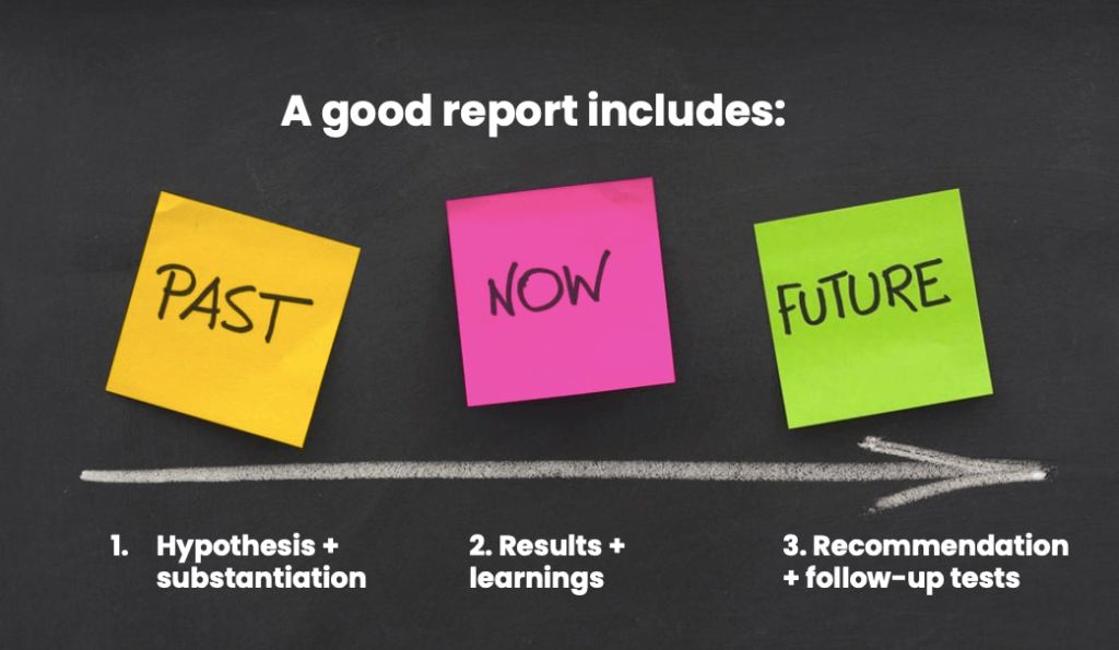 In elke goed opgestelde rapportage moeten drie onderdelen terugkomen. Je kunt deze onderdelen onthouden aan de hand van een ezelsbruggetje: heden, verleden, en toekomst. Net zoals er drie dimensies van tijd zijn, zijn er dus ook drie onderdelen in je rapportage. Bij het verleden beschrijf je welke hypothese je wilde toetsen, en hoe je tot deze hypothese bent gekomen (de onderbouwing). Bij het heden beschrijf je de resultaten van de huidige A/B-test en wat je hiervan hebt geleerd. Bij de toekomst beschrijf je de aanbevelingen (implementeren of niet) en hoe je verder gaat bouwen op deze inzichten. Al deze onderdelen worden in deze blogserie toegelicht aan de hand van een voorbeeldcase voor een van mijn klanten.